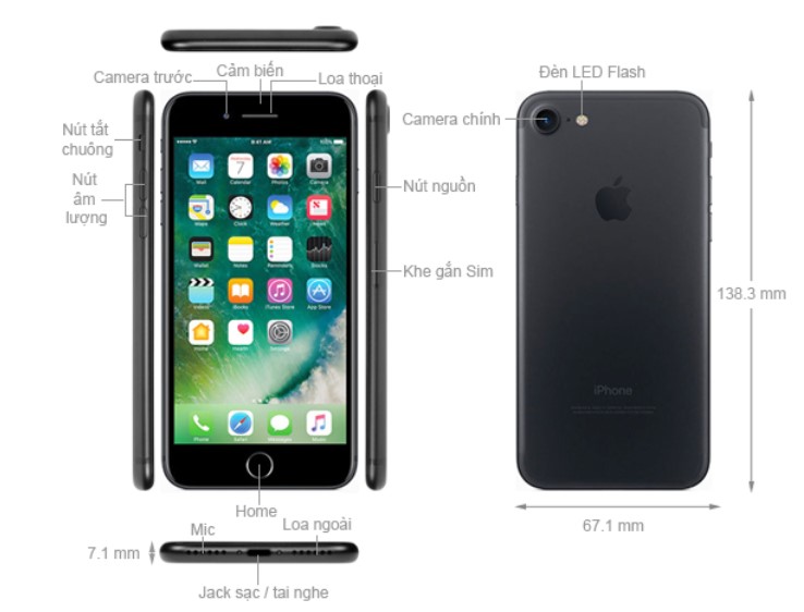 iPhone 7 mang trên mình thiết kế quen thuộc từ thời iPhone 6, máy được trang bị bộ nhớ lưu trữ lớn, khả năng chống nước cao cấp, dàn loa stereo cho âm thanh hay và cấu hình cực mạnh.